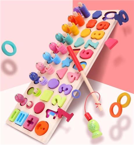 INBEGREPEN. - 1x houten speelbord (420x150mm) - 10x vissen + hengel - 55x ringen (diverse kleuren) - 10x houten cilinders voor telraam - 10x geometrische vormen - 3x rekenformule tekens - 10x cijfers (1 t/m 10)