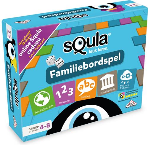 Het sQula Familie bordspel is een educatief spel met een speeltijd van 30 minuten. Het bevat 180 vragenkaarten met 900 vragen, 4 Squla pionnen, 4 scoreboekjes, fiches en regenboogdelen, speelbord, 2 dobbelstenen en spelregels. Het spel is geschikt voor kinderen vanaf 4 jaar en heeft een aanbevolen maximum leeftijd van 99 jaar.