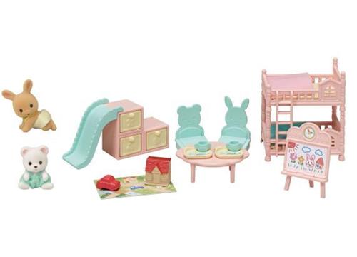 Creëer een betoverende kinderkamer met de Sylvanian Families 5397 speelkamer met babyspeelfigurenset. Deze schattige set bevat twee babyfiguren, de Sunny Rabbit Baby (kruipend) en de Polar Bear Baby (zittend), die perfect zijn voor urenlang speelplezier. Met een diversiteit aan meubels en accessoires, zoals een stapelbed, een tafel met stoelen en een glijbaan, kunnen kinderen hun eigen fantasiewereld in Sylvania creëren.