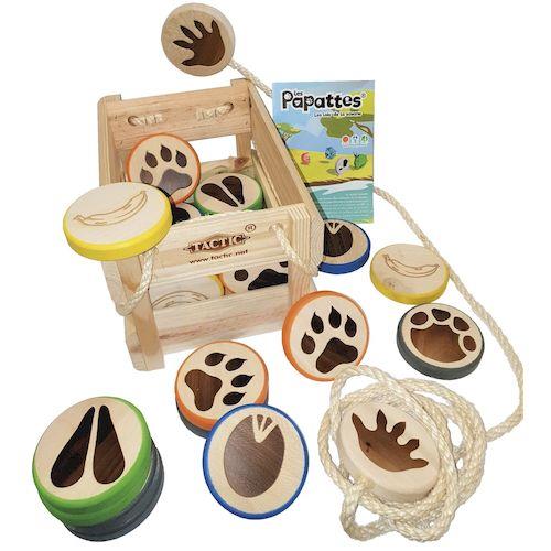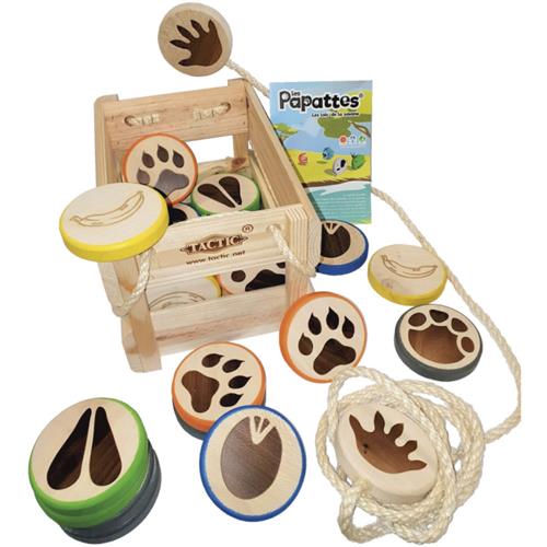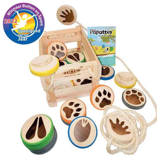 | Verpakkingsinhoud | - Een transportbox - De rivier (1 x 3m touw met aan elk uiteinde 1 krokodillenpoot) - 4 Papattes (poten) van Lou de Zebra (Blauw) - 4 Papattes (poten) van Tod de Olifant (Grijs) - 4 Papattes (poten) van Zoé de Gazelle (Groen) - 4 Papattes (poten) van George de Leeuw (Oranje) - 4 bananen van de gekke apen -Spelregels |