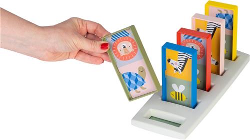 De supergrote, dubbelzijdige dominostenen (6x12cm) zijn perfect voor kleine handjes en bevatten aan de ene kant illustraties en aan de andere kant geometrische vormen en aantallen. Hierdoor groeit dit dominospel mee met je peuter en stimuleert het de fijne motoriek, cognitieve vaardigheden, hand-oogcoördinatie, kleur- en vormherkenning.