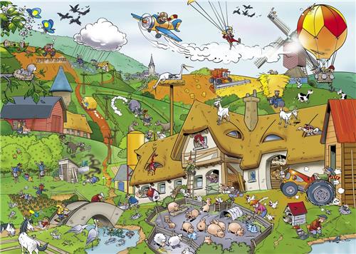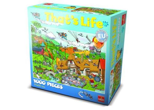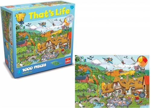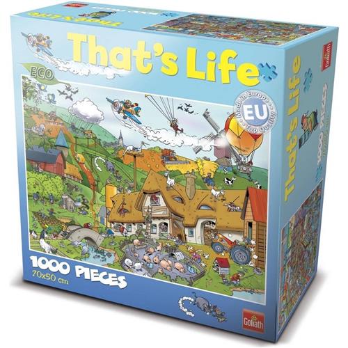 Met de That's Life-puzzel van 1000 stukjes haal je een stukje boerderijleven in huis. De puzzel bevat afbeeldingen van verschillende dieren, zoals paarden, varkens, geiten, vogels en ooievaars. Het puzzelthema is cartoon en de puzzelstukjes zijn gemaakt van karton. De puzzel heeft een groene kleur en heeft een afmeting van 68 cm x 48 cm x 3 mm.