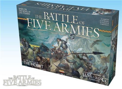 The Battle of Five Armies, gebaseerd op Tolkiens roman The Hobbit, plaatst de gastheren van de Elvenking, de Dwergen van Dain Ironfoot en de Mannen van het Meer onder leiding van Bard the Bowman tegenover een horde Wolven, Goblins en Bats onder leiding van Bolg, zoon van Azog. Zal Gandalf het tij keren voor de Vrije Volkeren? Komen de Eagles of schiet Beorn te hulp? Of zal Bilbo de Hobbit omkomen in een laatste stand op Ravenhill? De Battle of Five Armies heeft een spelbord dat de oostelijke en zuidelijke uitlopers van de Lonely Mountain en de vallei die ze omringen vertegenwoordigt, en een aantal plastic figuren die troepen, helden en monsters vertegenwoordigen.