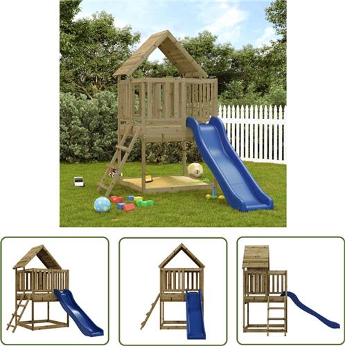Met de Living Store Speeltoren van geïmpregneerd grenenhout kunnen jouw kinderen thuis eindeloos spelen en avonturen beleven in de achtertuin. Dit duurzame speeltoestel is vervaardigd van massief grenenhout dat onder vacuüm is geïmpregneerd, waardoor het bestand is tegen rot en weersinvloeden. Het stevige frame zorgt voor stabiliteit en veiligheid, terwijl het 90 cm hoge platform, de golvende glijbaan, ladder en zandbak zorgen voor veel speelplezier.
