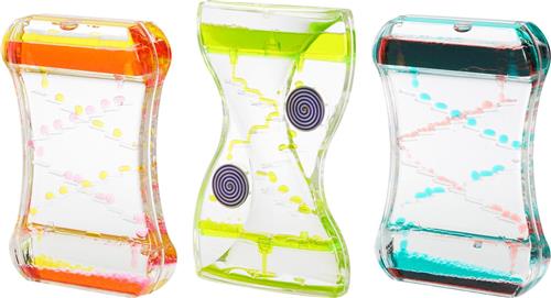 De set bevat twee verschillend gekleurde zandlopers in rood en blauw, maar ook roze en geel en een eenkleurige groene zandloper met een paarse tol. Een van de zandlopers bevat een draaiend apparaat in de bovenste en onderste helft, wat de visuele fascinatie nog groter maakt als de olie naar beneden stroomt en ronddraait. Deze vloeibare timers zijn geschikt voor activiteiten variërend van sensorische integratie tot stressverlichting, omdat het zachte stromen van de olie van boven naar beneden een kalmerend effect heeft.