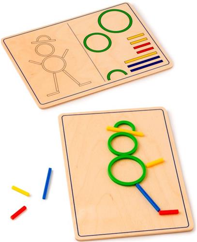 Creëer figuren met de ringen en stokjes in verschillende kleuren. Maak de opdrachtkaarten na of maak je eigen unieke creaties. Verbeter de fijne motoriek en de ruimtelijke oriëntatie.