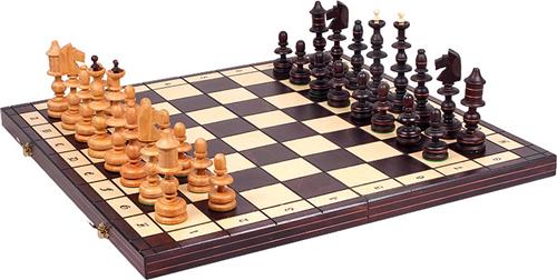 Een prachtig traditioneel Pools schaakset met een decoratief ontwerp. Dit schaakset wordt geleverd inclusief een opklapbaar schaakbord en gewogen schaakstukken. De schaakstukken zijn ontworpen met een slank design, gemaakt van hoogwaardig kersenboomhout en wegen zodat ze stevig op het bord blijven staan.