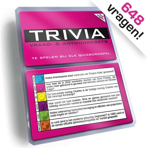 De Triviant Vragen Aanvulset in de Versie Roze bevat nieuwe vragen voor het jaar 2023 - 2024! Met maar liefst 648 gloednieuwe vragen is deze set perfect om toe te voegen aan elk bordspel. De quizvragen zijn gevarieerd en vallen binnen de categorieën Geografie, Entertainment, Cultuur, Historie, Wetenschap en Sport. Of je nu Triviant speelt of op zoek bent naar een zelfstandig quizspel, deze aanvulset biedt eindeloos speelplezier.