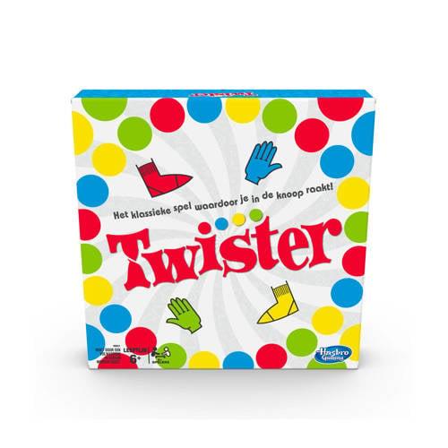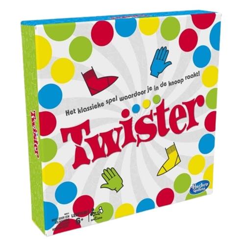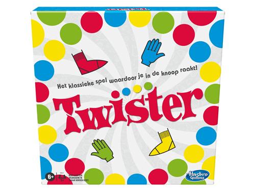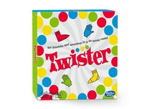 Andere manieren om Twister te spelen! Speel in teams! Teamleden kunnen dezelfde plek delen, maar pas op dat je je balans niet verliest. Zodra een speler omvalt of de mat raakt is het team af. Houd en teamtoernooi en houd overwinningen en nederlagen bij. Of speel een knock-out ronde totdat er nog één team over is. Laat het Twister plezier maar komen! Neem je Twister spel mee naar buiten of speel Twister tijdens een avondje met vrienden. De iconische mat met gekleurde vakken is een fantastische manier om van een feest een feest te maken! Inhoud: - Twister-mat - 1 draaiwijzer - Spelregels