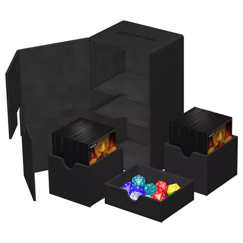Onze Ultimate Guard Twin Flip'n'Tray 200+ biedt alle kenmerken die een geweldige deckbox nodig heeft. Deze box is de grote broer waar iedereen naar op zoek is, en verdubbelt de grootte van onze klassieke Flip'n'Tray 100+. De Twin Flip'n'Tray 200+ kan 200 dubbel-gehoesde of 240 enkel-gehoesde standaardformaat kaarten bevatten. Ontworpen voor 200 dubbel-gehoesde of 240 enkel-gehoesde standaardformaat kaarten in Ultimate Guard Sleeves. Het heeft een modulair ontwerp om te combineren met verschillende Ultimate Guard producten, met verwijderbare kaart- en accessoirelades voor onafhankelijke toegang tot elke lade. Gemaakt van bestendig Xenoskin materiaal in een monokleurig ontwerp met hoogwaardige microfiber binnenvoering. Bovendien is het voorzien van een sterke magnetische sluiting.