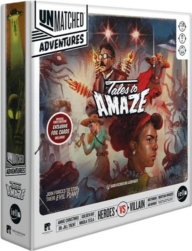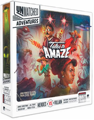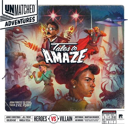 Unmatched Adventures: Tales to Amaze is themed around the pulp adventures, tall tales, and local legends of the mid-20th century, giving you a whole new way to play Unmatched. In the game, players work together to defeat one of two villains: Mothman or the Martian Invader. Each villain has a unique battlefield with unique objectives. The set comes with four new heroes: Nikola Tesla, Annie Christmas, The Golden Bat, and Dr. Jill Trent. Keeping to the Unmatched brand, you may use heroes from other Unmatched sets in Unmatched Adventures, and you can use the included heroes and battlefields to play competitive Unmatched.