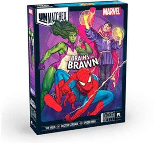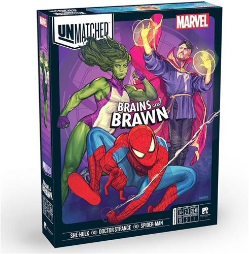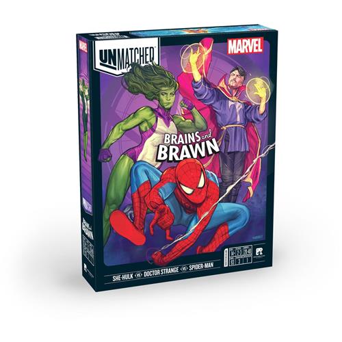 Unmatched: Brains and Brawn, het vijfde en laatste Unmatched Marvel-set, bevat enkele van de populairste helden van Marvel: Spider-Man, Dr. Strange en She-Hulk. Spidey zwaait rond op het slagveld, waarbij hij zijn spider-sense gebruikt om zichzelf veilig te houden. Dr. Strange heeft, nou ja, de beste kaartnamen in het spel: Aanschouw de Zeven Zonnen van Cinnibus! En She-Hulk zal niet aarzelen om het boek of wat voor zwaar object dan ook dat in de buurt is naar je te gooien. Zoals Stan the Man zou zeggen, Brains and Brawn bevat een verbazingwekkende verzameling verbazingwekkende artiesten. Cover- en She-Hulk-illustratie door stripveteraan Joshua "Sway" Swaby. Dr. Strange-illustratie door The Brave Union. En Spider-Man wordt tot leven gebracht door een favoriet van Unmatched, Oliver Barrett.