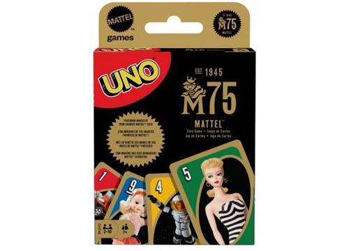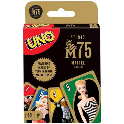 UNO, het klassieke kaartspel van Mattel, viert zijn 75e verjaardag met een speciale editie-deck dat Mattel-speelgoed door de jaren heen viert! Elke kaart is versierd met een andere favoriet uit de kindertijd, zoals Barbie-pop, Hot Wheels-auto's, Fisher-Price-voorschools speelgoed en meer. Gameplay is als klassiek UNO. Match kaarten op kleur of nummer en speel actiekaarten zoals Skip, Reverse en Wild Draw Four om de concurrentie wakker te schudden. Scoor punten door als eerste alle kaarten in je hand kwijt te raken, en als je nog maar één kaart over hebt, vergeet dan niet om "UNO!" Dit verzamelspel is een geweldig cadeau voor kinderen van 7 jaar en ouder, vooral speelgoedliefhebbers. Kleuren en decoraties kunnen variëren.