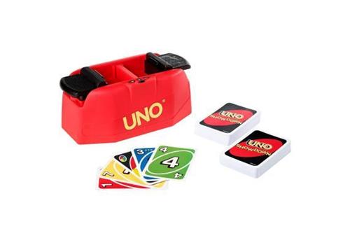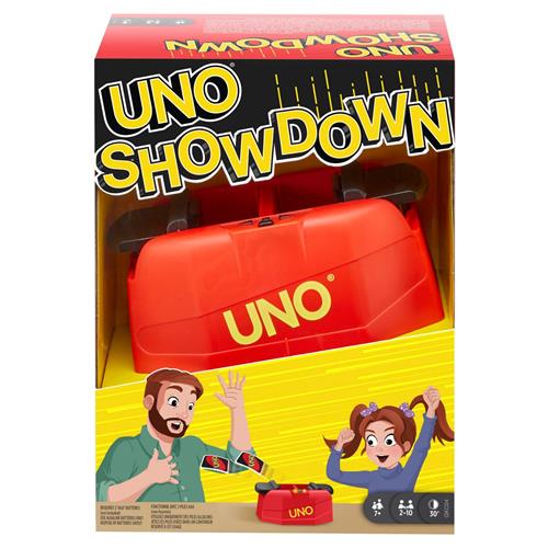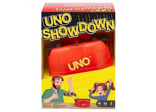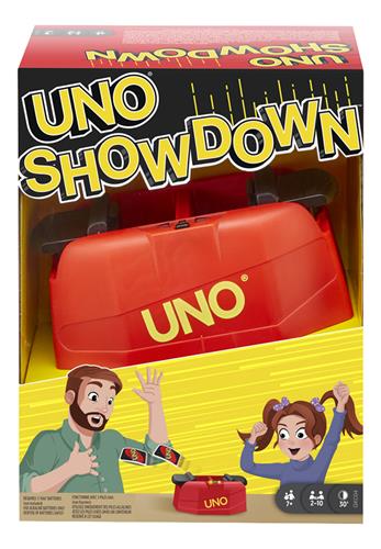 UNO Showdown is een kaartspel dat iedereen leuk vindt, maar met de onverwachte spanning van een plotselinge kaartenregen! Wanneer het lichtje aangaat en het signaal van de UNO Showdown unit afgaat, moet je zo snel mogelijk het pedaal omlaag duwen. De snelste speler wint de 'showdown' en laat kaarten uit de UNO Showdown naar de andere spelers vliegen!