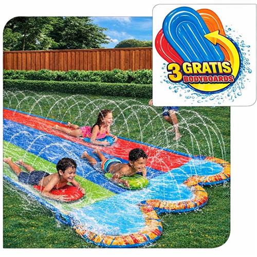Bij aankoop van de waterglijbaan ontvang je ook drie opblaasbare bodyboards. Deze zorgen ervoor dat elk kind comfortabel en veilig kan glijden, waardoor het plezier voorop staat. Dankzij de ruime afmetingen is er meer dan genoeg ruimte voor meerdere kinderen om samen te spelen en te genieten van een actieve dag in de zon. Het maakt verjaardagsfeestjes en zonnige middagen onvergetelijk!