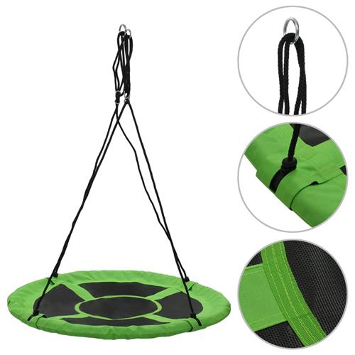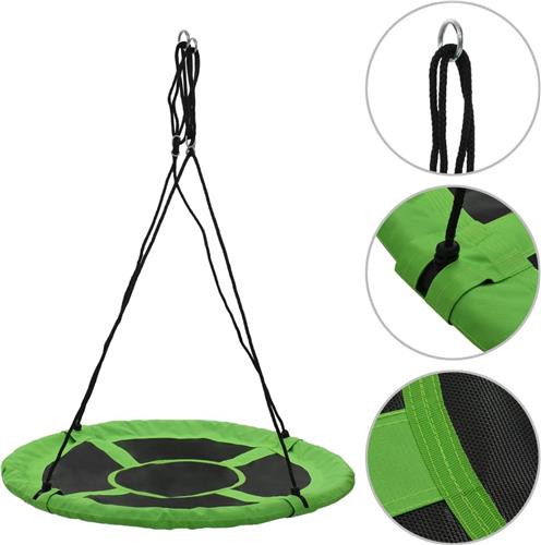 Laat je kleintje eindeloos plezier beleven in de eigen achtertuin met deze groene vidaXL schommel. Gemaakt van duurzaam oxford stof, PP mat en PE touw, is deze schommel stabiel, veilig en weerbestendig, ideaal voor buiten gebruik. De ophangtouwen zijn verstelbaar met haken, zodat de schommel aangepast kan worden voor kinderen van verschillende leeftijden. Met een diameter van 110 cm en een draagvermogen van 100 kg is deze schommel geschikt voor kinderen vanaf 3 jaar.