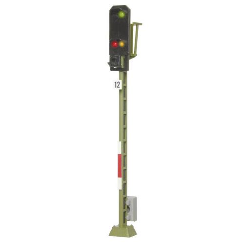 Viessmann Modelltechnik 4012 H0 Lichtsein Inrijsein Kant-en-klaar model DB is een prachtig H0 inrijsein met 3 LED's, compleet kant-en-klaar voor gebruik. Dit sein bevat niet alleen LED's en voorweerstanden, maar ook cijfers en letters voor extra detail. De messing mast zorgt voor een authentieke uitstraling op je modelspoorbaan. Met een hoogte van 79 mm is dit sein geschikt voor spoorwegmaatschappij DB en past het perfect in schaal H0. De voedingsspanning van dit model ligt tussen 12 en 16 V DC/AC, waardoor het soepel werkt op je baan.