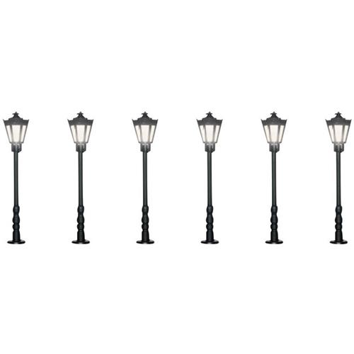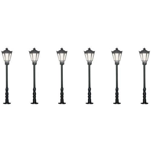 De Viessmann Modelltechnik N Parklantaarn Enkel Kant-en-klaar model 64706 set is een voordelige set met 6 parklantaarns, perfect voor het verfraaien van het stadscentrum of een pittoresk park. Deze gedetailleerde modellen zijn ideaal voor het toevoegen van realisme aan uw modelspoorbaan in schaal 0.