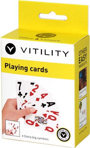 Vitility is Europa's snelst groeiende fabrikant en leverancier van producten in de diabetes-, home care-, health- en fitnessbranche. Vitility biedt met een breed assortiment handige producten die het leven een stuk makkelijker maken. Op het gebied van gezondheid, fitness en huishouden worden innovatieve hulpmiddelen gecreëerd met een modern design. Elk product is met de grootste zorg ontworpen voor optimaal gebruiksgemak. De speelkaarten hebben extra grote symbolen, zodat de kaarten veel duidelijker te lezen zijn.