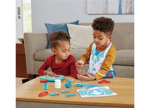 Met de VTech Verzorg & Leer Doktersset kunnen kinderen van 2 tot 5 jaar spelen en leren tegelijk. Deze educatieve speelset wordt geleverd met 15 accessoires en gezongen liedjes om het speelplezier te vergroten. De doktersset is kleurrijk en gemaakt van verschillende materialen zoals ABS, hout, karton, rubber en textiel. Daarnaast maakt het geluid, wat de speelervaring nog levendiger maakt. Het speelgoed werkt op 2 batterijen en is van het kwaliteitsmerk VTech.