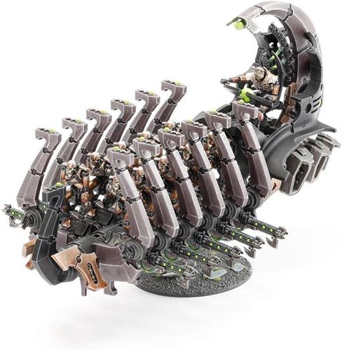 De Necron Ghost Ark wordt vaak ingezet als conventioneel transportvoertuig, waarbij versterkingen naar een vitaal gebied van het slagveld worden gebracht of Necron-troepen de mogelijkheid krijgen om uit een onverwachte hoek aan te vallen. Het is een groot model met een imposante aanwezigheid in een verzameling miniatuurfiguren. Enorme motoren bevinden zich aan de achterkant van het model, en het frame vertoont details zoals bollen en dynastische symbolen. Bovenop de Ghost Ark zit een Necron Lord op een bevelvoerende positie. Voor de Lord staat een rij Necron Warriors opgesteld alsof ze zich binnenin de enorme ribbenkast van een oerbeest bevinden. De Ghost Ark bevat ook krachtige wapens met vijf gauss flayers aan elke zijde. Deze meerdelige plastic doos bevat 168 onderdelen, twee kleine vliegstelen, een groot vliegstandaard en twee Necron-transfersheets waarmee je een Necron Ghost Ark of een Doomsday Ark kunt bouwen. Deze set is onbeschilderd en vereist montage - we raden aan om Citadel Plastic Lijm en Citadel Verf te gebruiken.