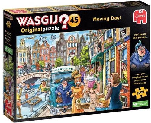 Beleef uren puzzelplezier met de Wasgij Original 45 Verhuisdag! puzzel van Jumbo. In deze uitdagende legpuzzel van 1000 stukjes staat de verhuisdag centraal. Terwijl Oma Wasgij geniet van haar vakantie in de oude binnenstad van Amsterdam, ontstaat er chaos rondom een verhuizing aan de gracht. Honden blaffen, katten blazen en remmen piepen. Wat ziet oma dat de mensen zo doet schrikken? Jij mag het mysterie ontrafelen en het tafereel compleet maken.