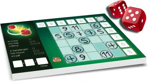 | Verpakkingsinhoud | 2 Dobbelstenen 4 Potloden Scoreblok Spelregels |