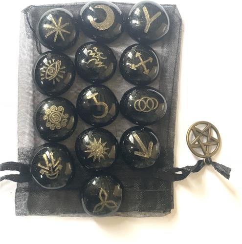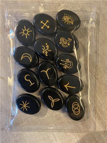 De Heksen Runen bestaan uit 13 symbolen en zijn in tegenstelling tot de Futhark runen géén alfabet. Deze runen corresponderen met de 12 sterrenbeelden en het alziend oog, met de uren van de tijd die eindigen op middernacht, Witching hour. De dertiende rune, de allerbelangrijkste draagt de energie van de vorige twaalf in zich. Het is the Watcher. De oorsprong van deze runen is onbekend maar de symbolen zijn bekend in Europa, Afrika, India, al ver voor de Middeleeuwen. De zigeuners gebruiken de symbolen ook op amuletten. De set bestaat uit 13 mooie platte basalt stenen en komt in een mooi jute zakje, samen met een uitgeprinte uitleg. Let op: elke steen is uniek en wordt apart gegraveerd, dus ze kunnen enigszins afwijken van de foto's!